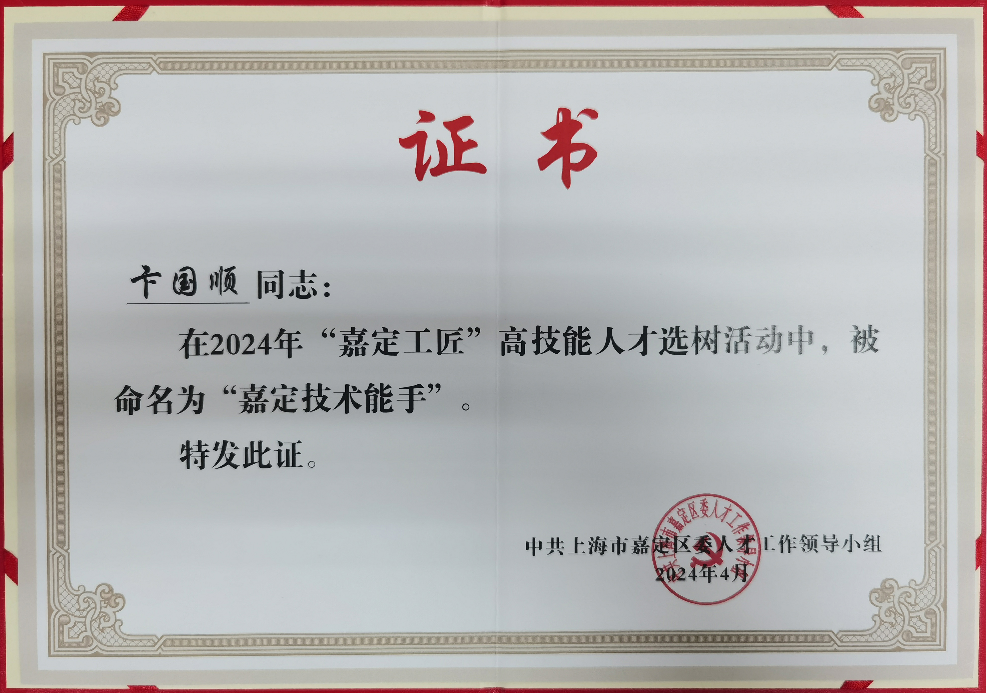 近日,在2024年“嘉定工匠”高技能人才選樹活動中,我司副總經理卞國順先生被評為“嘉定技術能手”。