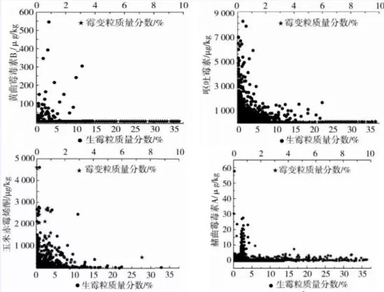 中儲糧姜友軍等人的研究指出:玉米不同含量生霉粒和霉變粒中玉米黃曲霉毒素、赭曲霉毒素、赤霉烯酮、嘔吐毒素的高低不存在相關性,因此不能僅僅通過感官檢驗玉米中霉粒多少及霉變情況從而判定霉菌毒素含量的高低。