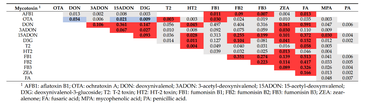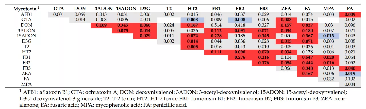 據(jù)Weaver等(2021)發(fā)表在Toxins上一篇持續(xù)7年、累計(jì)828個(gè)樣品、對(duì)35種霉菌毒素的調(diào)查報(bào)告,單胃動(dòng)物日糧的主要原料玉米樣品(n=711)中,萎蔫酸(FA)和嘔吐毒素(DON)成對(duì)出現(xiàn)的概率最大,為0.591(p<0.001)。而萎蔫酸檢出時(shí),伏馬毒素B1、B2、B3(FB1、FB2、FB3)出現(xiàn)的概率較大,分別為0.513(p<0.001)、0.417(p<0.001)、0.326(p<0.001),詳見(jiàn)表1。